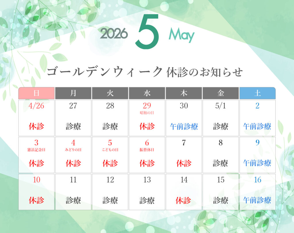 ゴールデンウィーク期間は暦通り(カレンダー通り)のお休みとなります。